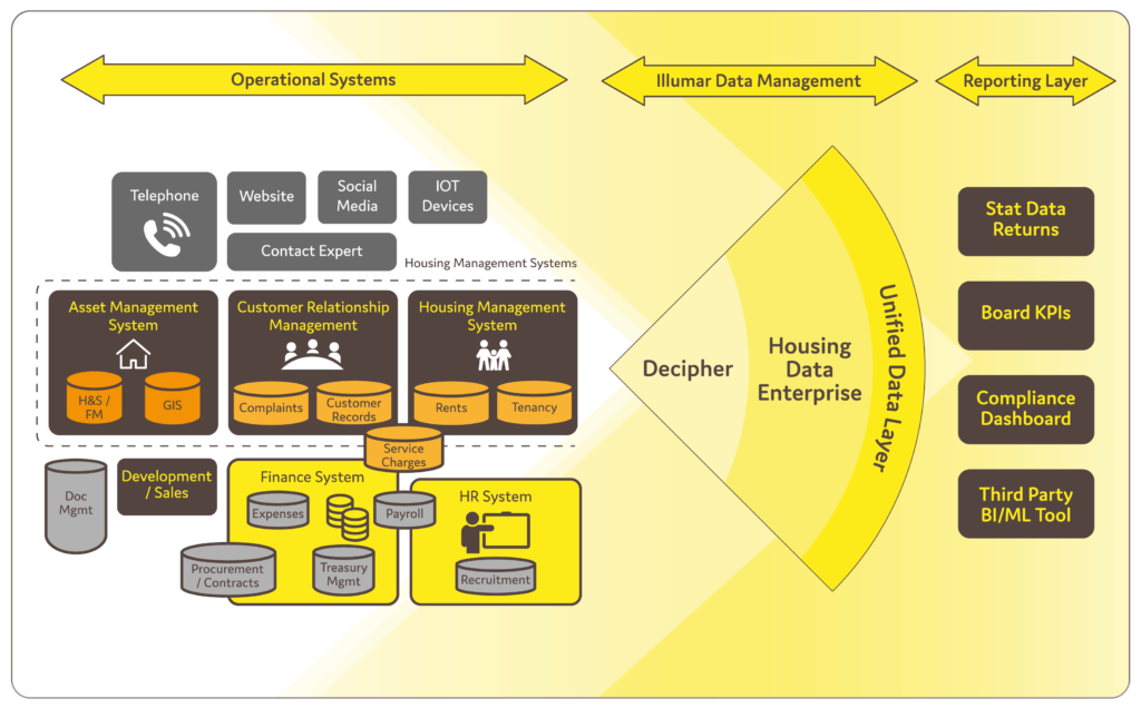 Because of Illumar’s standard architecture and business rule management, you can apply updates or modify underlying platforms, such as an upgrade to operational housing systems, without needing to recode all the interfaces. Our solution has the ability to extract data from any source system in any format. We’ll support every step of your digital transformation journey.